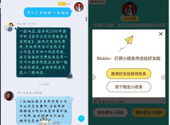 活动第一个环节是“疫情万事知”,此环节以知识竞答的方式补充了同学们关于疫情的知识,并更加了解此次疫情中抗疫在一线的英雄的故事。第二个环节名为“疫间趣事多”,大学同学来自不同的地区,每个地区有自己的文化和风俗,分享自己在家的趣事一方面可以放松大家的心情,另一方面可以了解不同同学的有趣的一面。第三个环节是“敞开心扉说一说”,这个环节借助QQ群应用“小纸条”功能,同学们可以把自己在疫情期间的情绪或者是其他想法写下来,但是必须带有特殊符号。班级同学可以互相抽取小纸条观看,然后在群中说出自己所抽取纸条的特殊符号然后再分享自己想对这个同学说的话。同学们尽情说出自己心中的想法,舒缓了在疫情期间紧张的心情。