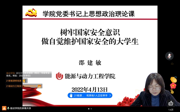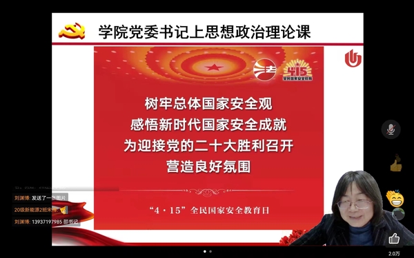 党委书记邵建敏讲授了以“树牢国家安全意识,做自觉维护国家安全的大学生”为主题的思想政治理论课,课程以线上腾讯会议的方式开展,全体辅导员、本科生和研究生参加并学习了此次线上课程。