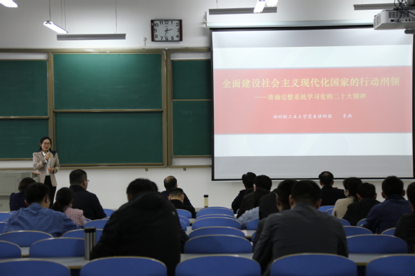 李老师以《全面建设社会主义现代化国家的行动纲领——准确完整系统学习党的二十大精神》为题,重点从六个“立足”——从立足新时代看新成就、立足新问题看新思想、立足新征程看新任务、立足新环境看新战略、立足新形势看新斗争、立足逻辑主线看本质对党的二十大精神进行了深入细致的解读。报告最后,李老师强调学习的目的是为运用,宣传的作用是为了贯彻。报告作为夺取新时代中国特色社会主义伟大胜利的政治宣言和行动纲领,我们既要通过学习弄通蕴含其中的道理、学理、哲理,更要坚持学思用贯通、知信行统一,在工作中加以贯彻落实。作为高校教师,我们要提升政治站位,坚决做到“两个维护”;提升党性品格,坚决做到令行禁止;提升斗争意识,坚决守好立德树人主阵地;提升能力作风,坚决做好做优本职工作。