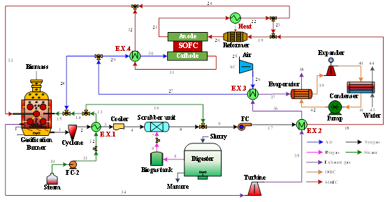 城市固体废物气化制氢并耦合固体氧化物燃料电池(SOFC)发电,是一条兼具废物增值利用与清洁能源供给潜力的技术路径。在气化技术中,空气气化虽能实现自热运行,但存在氢气产率低的问题;水蒸气气化能提高氢气浓度,却需外部补热,传统的电加热和部分氧化技术缺陷明显。本研究提出一种新型PGR/AB-AD-SOFC-GT-ORC混合系统,利用SOFC阳极尾气燃烧产生的热量为热解气化反应器(PGR)供热,并将PGR与后燃室(AB)设计为一体化结构。研究对该混合系统开展了全面的5E分析,涵盖能量、㶲、㶲经济性、环境与效率维度。在此基础上,引入机器学习模型与NSGA-II多目标优化算法,以系统CO₂排放低于传统石油燃料系统(0.236 t/GJ)为约束,对最高发电效率和最低平准化能源成本(LCOE)进行优化。研究结果表明,在最佳折衷解下,系统㶲效率达43.60%,发电效率达44.03%,CO₂排放为0.229 t/GJ,LCOE为0.03959 $/kWh。该混合系统在提升能源效率的同时降低了排放与成本,为城市固废物制氢系统提供了一种可行的解决方案。