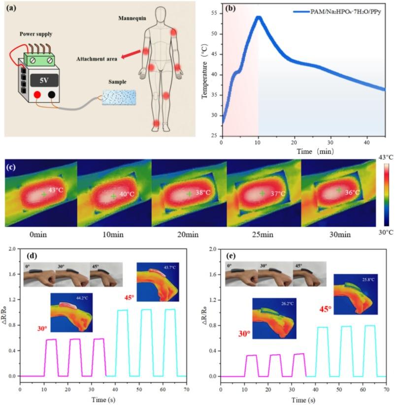 研究结果表明,该相变水凝胶实现了84.06%的高封装效率,相变焓达160.3 J·g⁻¹,比热容峰值达到7.6 J·g⁻¹·K⁻¹,热导率提升46%,电热转换效率高达91%(5 V低电压),应变系数(GF)为2.85,断裂伸长率达374%,该材料可承受超过180°扭转、折叠,且能紧密粘附于手掌、塑料、橡胶等多种表面。在实际应用中,18 g材料经5 V电加热10分钟后,可在40–43°C平台释放热量10分钟,并继续在37–40°C维持15分钟,总有效热疗时间超过25分钟;同时,该材料在室温或热敷状态下均能实时监测腕关节0°、30°、45°弯曲角度的电阻信号变化,实现了“电热驱动—精准热疗—关节运动监测”一体化功能。